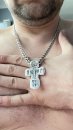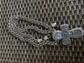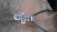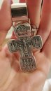 Изображено на кресте: Распятие Христово. Святая Троица. Святой Николай Чудотворец. Мученик Трифон. Три святителя. Икона Божией Матери "Толгская". Ангел Хранитель. Преподобный Сергий Радонежский. Святой Спиридон Тримифунский.1. Размер: 7 х 4 мм