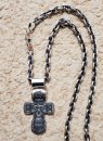 Крест обрамляет молитва. Это слова из Канона Кресту Господню: «Кресте всесильне, апостолов похвала, преподобных утверждение и верных знамение, иерархов и мучеников слава, победа и утверждение всех хвалящих тя. Кресте Честный, хранитель души и тела буди ми, образом своим бесы низлагая, враги отгоняя, страсти упражняя, и благословение даруя ми, и жизнь и силу, содействием Святаго Духа, и честными Пречистыя мольбами».